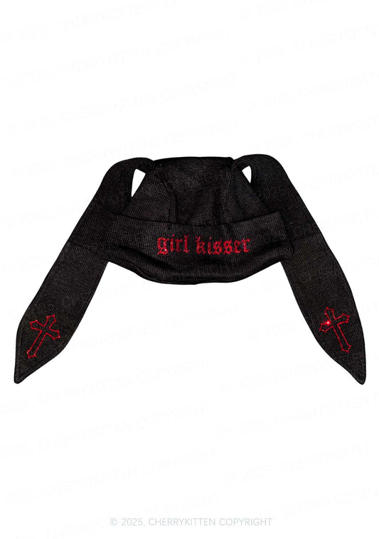 Rhinestone Girl kisser Pride Y2K Bunny Ear Knitted Hat Cherrykitten