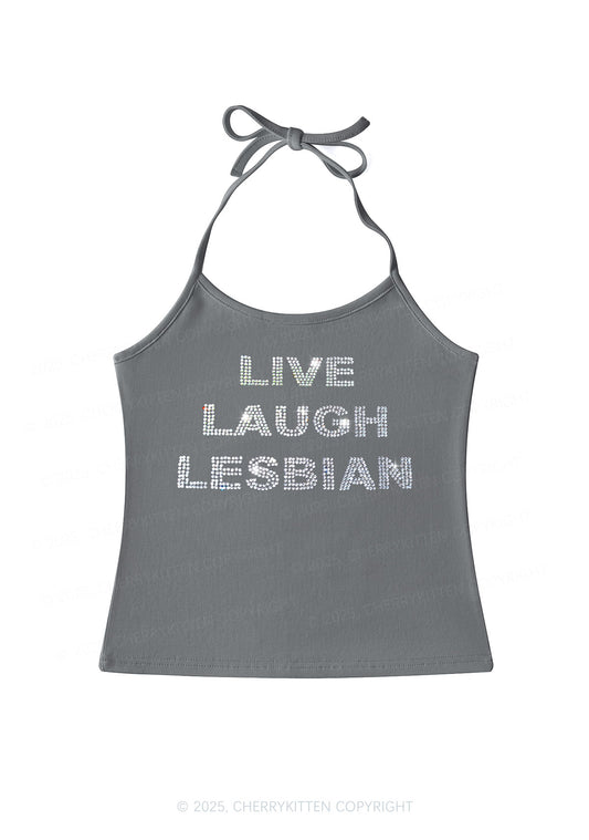 Rhinestone Live Laugh Lesbian Pride Y2K Halter Neck Cami Cherrykitten