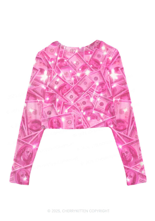 Pink Shiny Money Y2K Mesh Long Sleeve Crop Top Cherrykitten