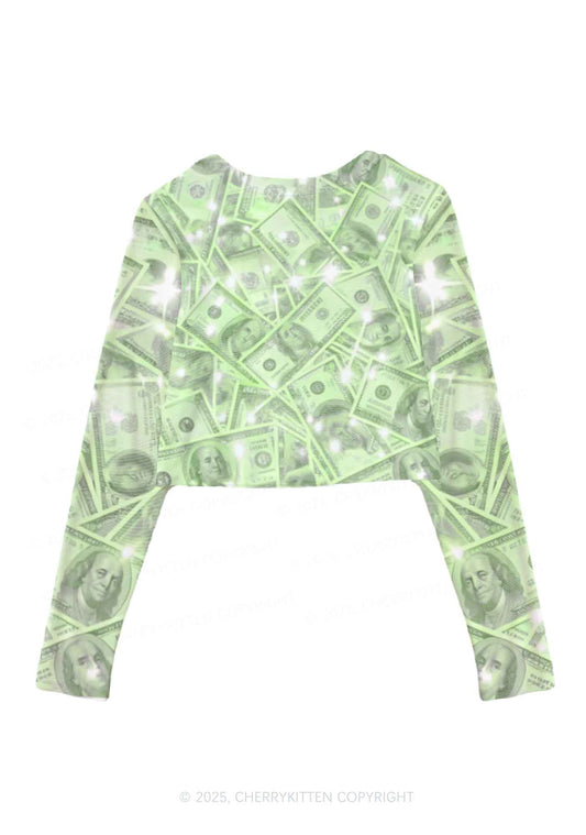 Green Shiny Money Y2K Mesh Long Sleeve Crop Top Cherrykitten