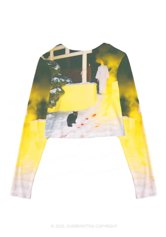 Snow Cat Y2K Mesh Long Sleeve Crop Top Cherrykitten