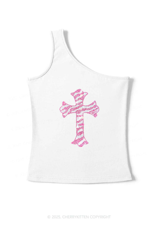 Rhinestone Pink Cross Y2K One Shoulder Tank Top Cherrykitten