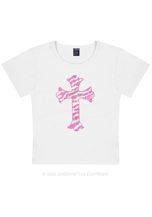 Curvy Rhinestone Pink Cross Y2K Baby Tee Cherrykitten