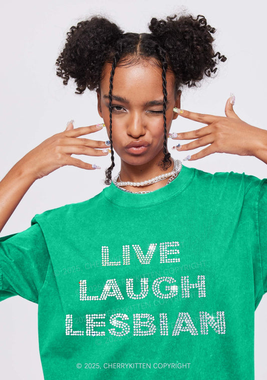 Rhinestone Live Laugh Lesbian Pride Y2K Shirts Washed Tee Cherrykitten
