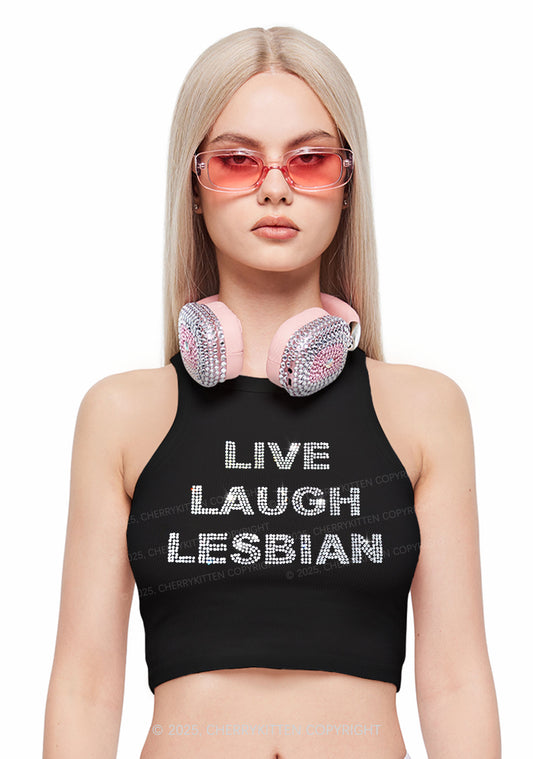 Rhinestone Live Laugh Lesbian Pride Y2K Crop Tank Top Cherrykitten