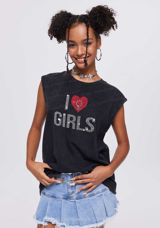 Rhinestone I Love Girls Pride Y2K Washed Muscle Tank Cherrykitten