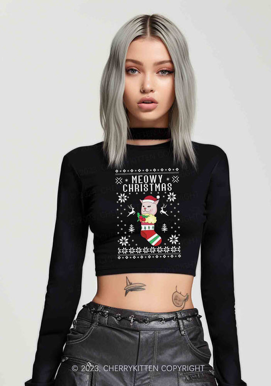 Meowy Christmas Socks Y2K Long Sleeve Crop Top Cherrykitten