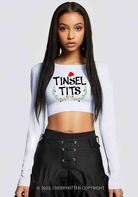 Christmas Hat Tinsel Txts Y2K Long Sleeve Crop Top Cherrykitten