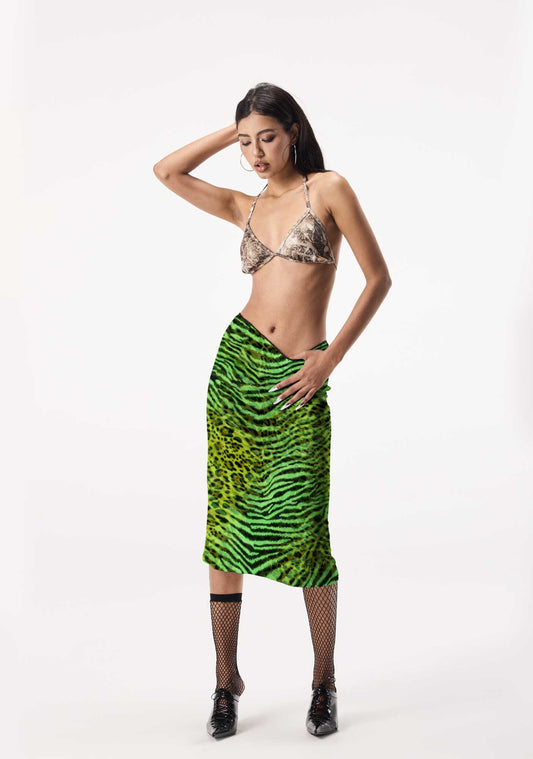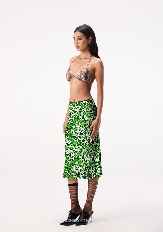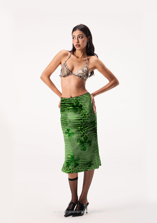 Green Zebra Leopard Pattern St Patricks Y2K Print Midi Skirt Cherrykitten
