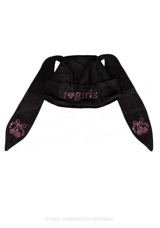 Rhinestone I Love Girls Pride Y2K Bunny Ear Knitted Hat Cherrykitten
