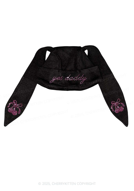 Rhinestone Yes Daddy Y2K Bunny Ear Knitted Hat Cherrykitten