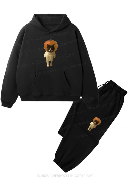 Halloween Pumpkin Head Cat Y2K Fleece Hoodie Set Cherrykitten