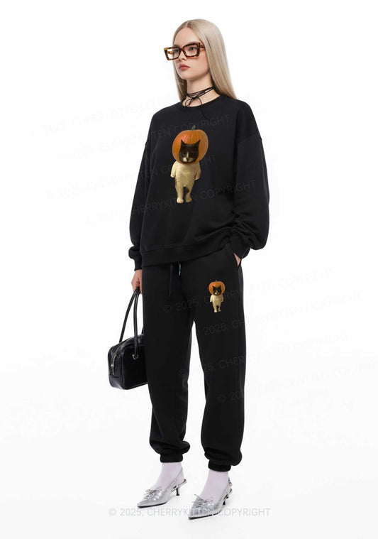 Halloween Pumpkin Head Cat Y2K Fleece Sweatshirts Set Cherrykitten