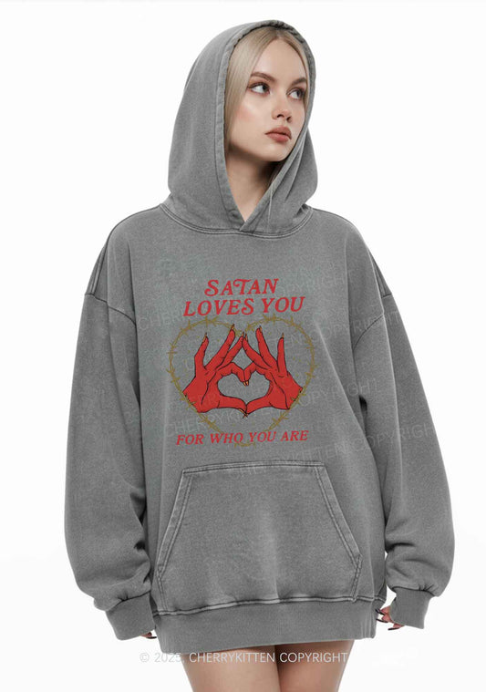 Halloween Satan Loves You Heart Y2K Washed Hoodie Cherrykitten