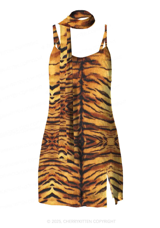 Wild Tiger Texture Y2K Mesh Slip Dress With Scarf Set Cherrykitten