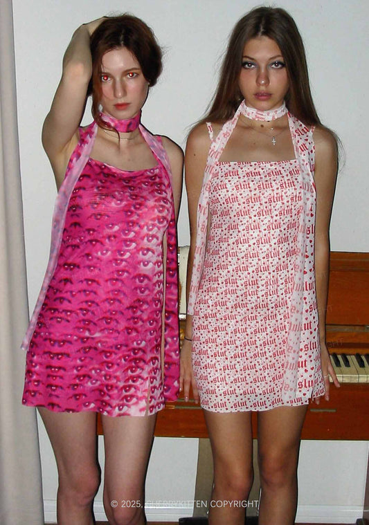 Halloween Pink Eyes Y2K Mesh Slip Dress With Scarf Set Cherrykitten