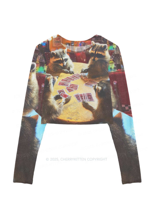 Raccoon Poker Y2K Mesh Long Sleeve Crop Top Cherrykitten