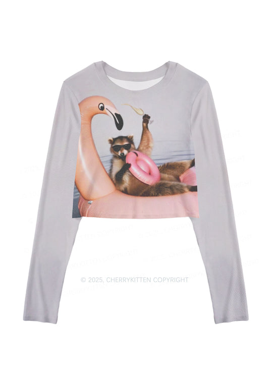 Flamingo Raccoon Y2K Mesh Long Sleeve Crop Top Cherrykitten