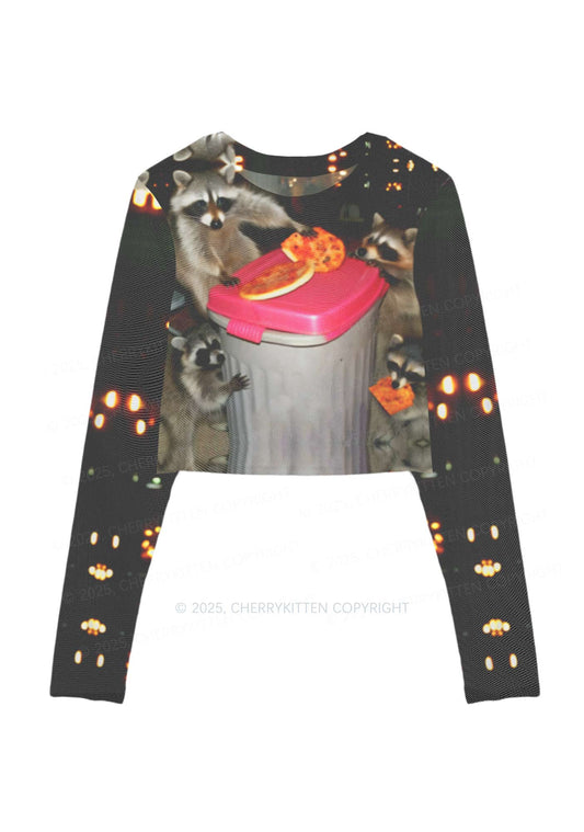 Raccoons Pizza Party Y2K Mesh Long Sleeve Crop Top Cherrykitten