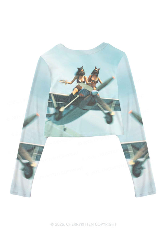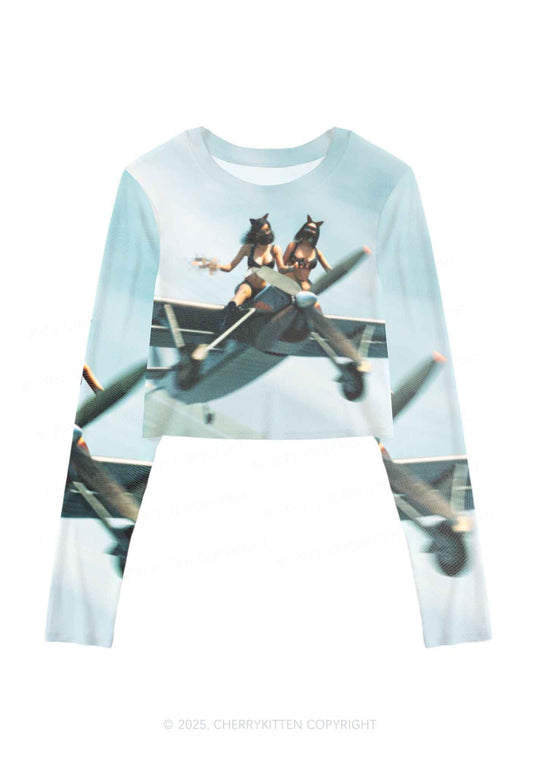 Girls Airplane Race Y2K Mesh Long Sleeve Crop Top Cherrykitten