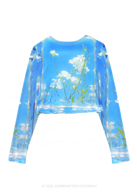 White Flowers Y2K Mesh Long Sleeve Crop Top Cherrykitten