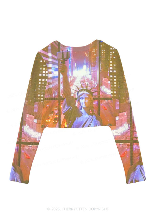 Statue Of Liberty Y2K Mesh Long Sleeve Crop Top Cherrykitten