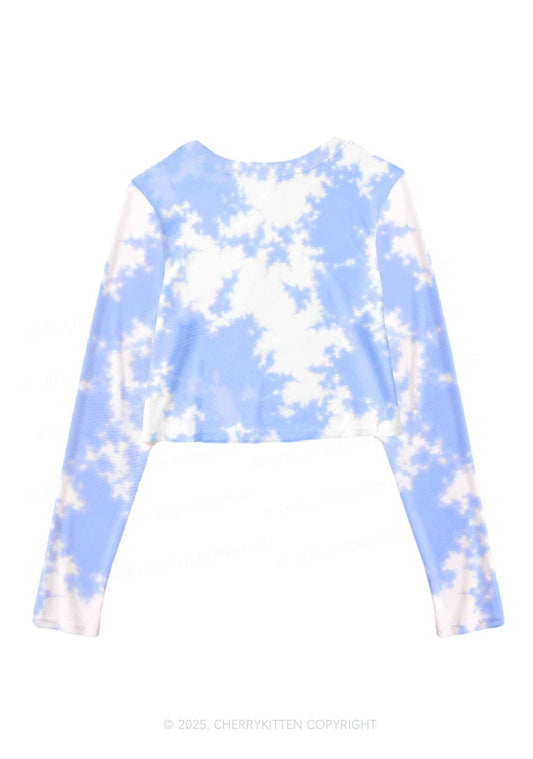 Blue Sky White Clouds Y2K Mesh Long Sleeve Crop Top Cherrykitten