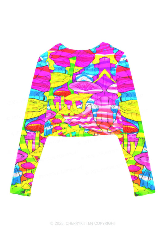 Trippy Colorful Mushrooms Y2K Mesh Long Sleeve Crop Top Cherrykitten