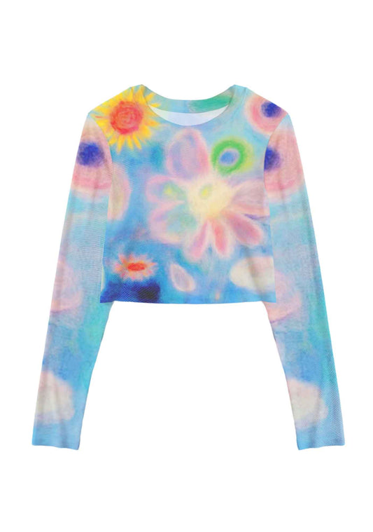 Blurred Blooms Y2K Mesh Long Sleeve Crop Top Cherrykitten