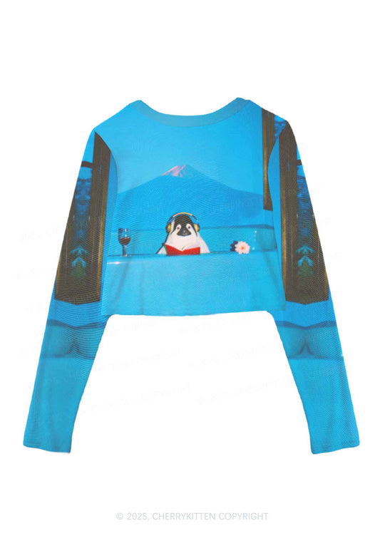 Penguin Reading Book Y2K Mesh Long Sleeve Crop Top Cherrykitten