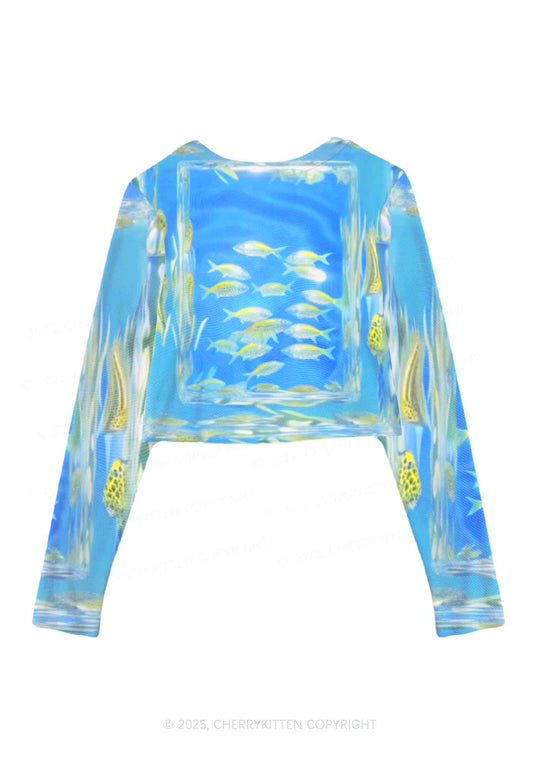 Undersea Fish Y2K Mesh Long Sleeve Crop Top Cherrykitten