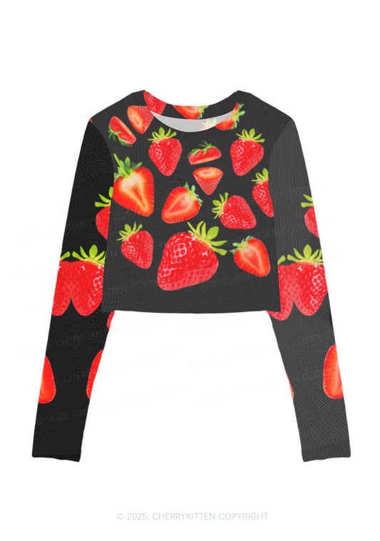 Black Strawberry Y2K Mesh Long Sleeve Crop Top Cherrykitten