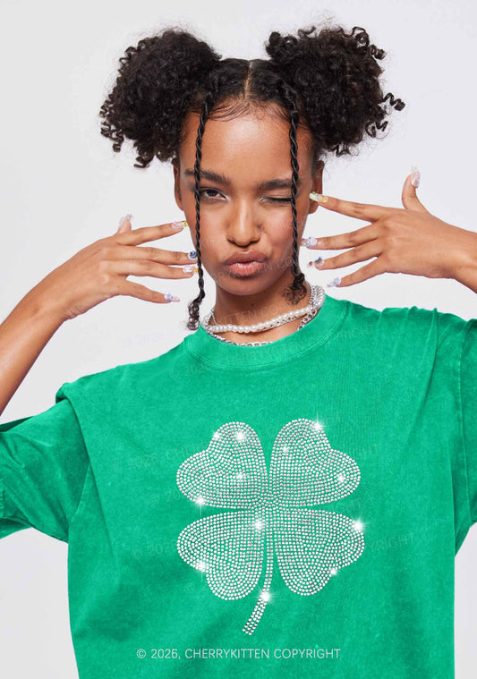 Rhinestone Four Leaf Clover St Patricks Y2K Shirts Washed Tee Cherrykitten