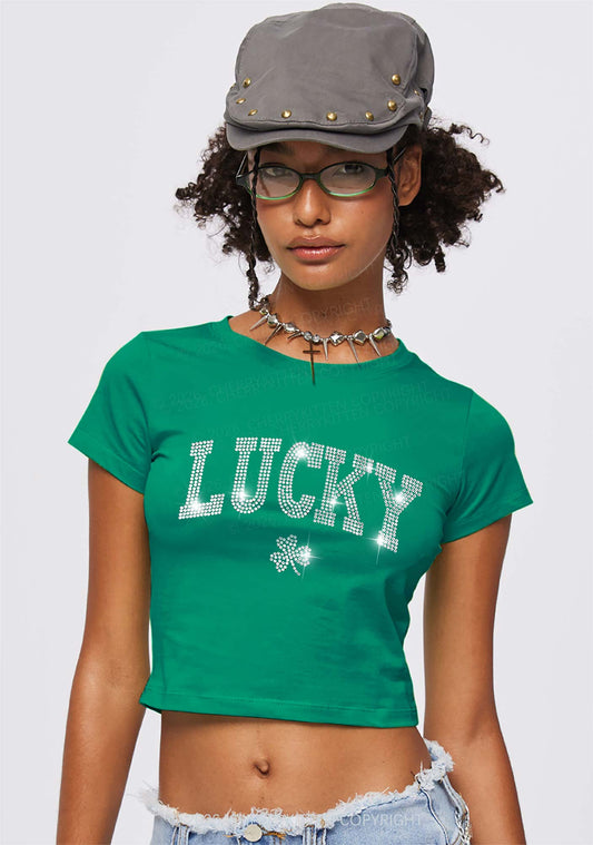 Rhinestone Lucky Shamrock St Patricks Y2K Baby Tee Cherrykitten