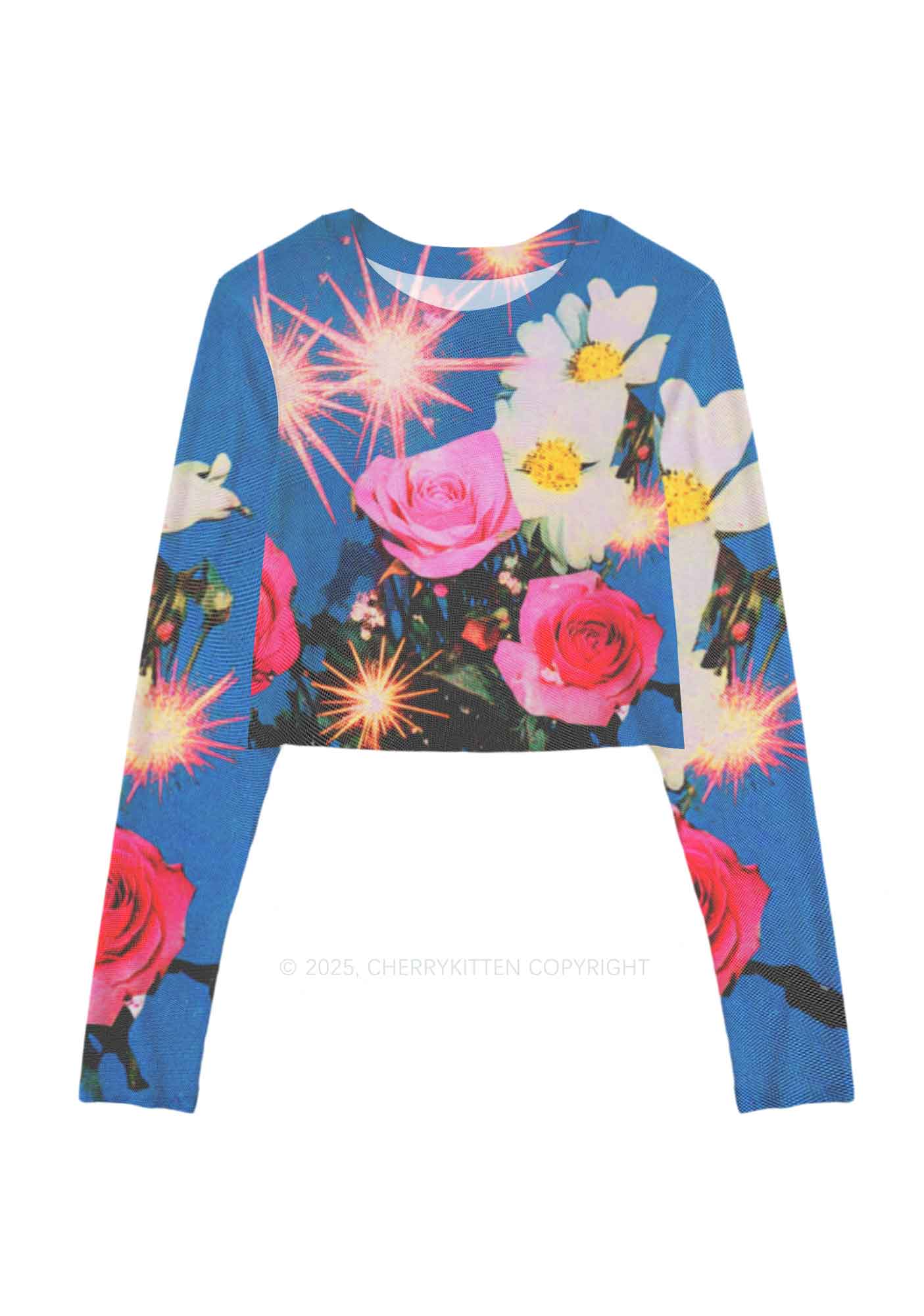 Blooming Flowers Y2K Mesh Long Sleeve Crop Top Cherrykitten