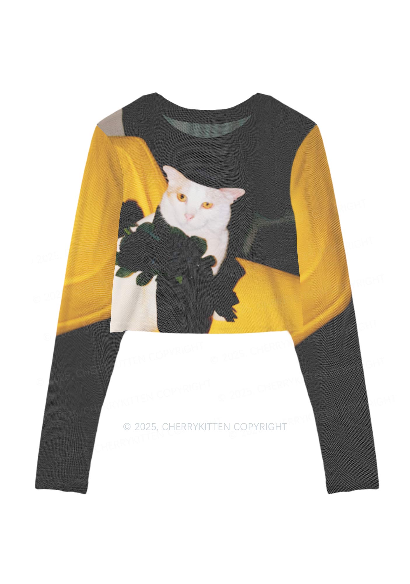 Cat With Black Roses Y2K Mesh Long Sleeve Crop Top Cherrykitten