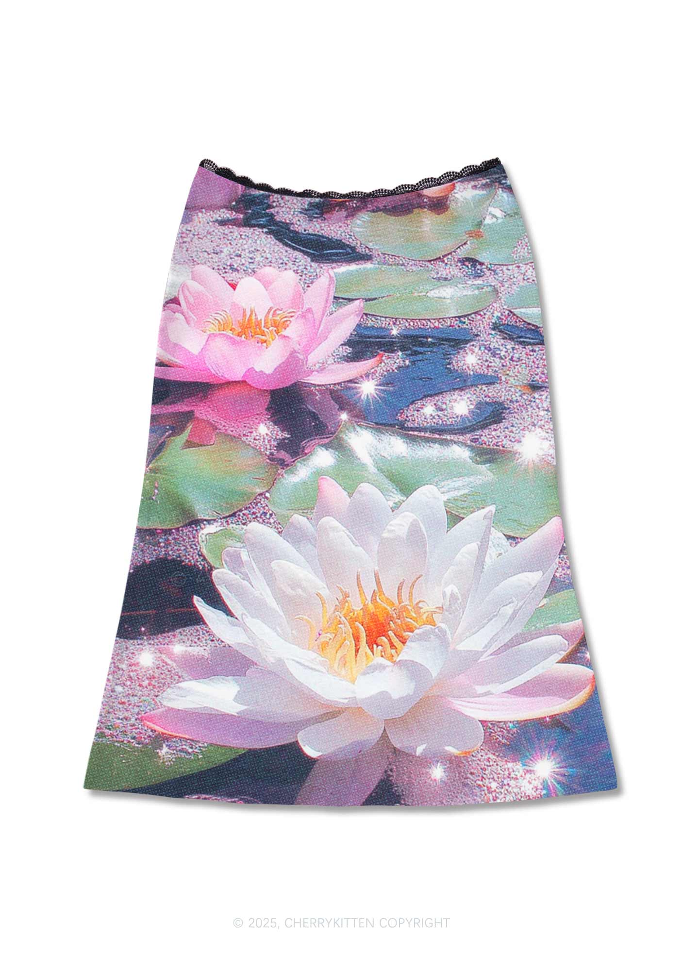 Glitter Lotus Y2K Print Midi Skirt Cherrykitten