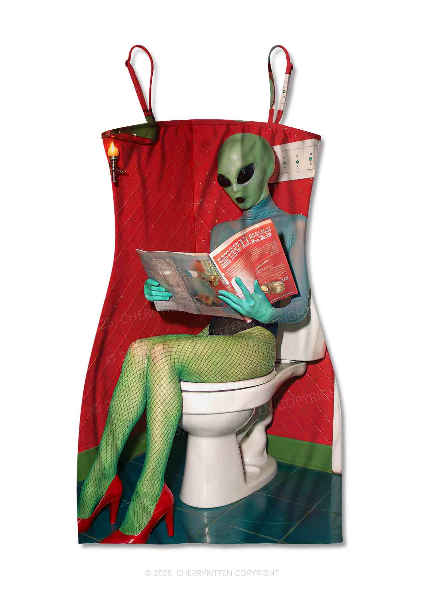Halloween Alien On Toilet Y2K Print Slip Dress Cherrykitten