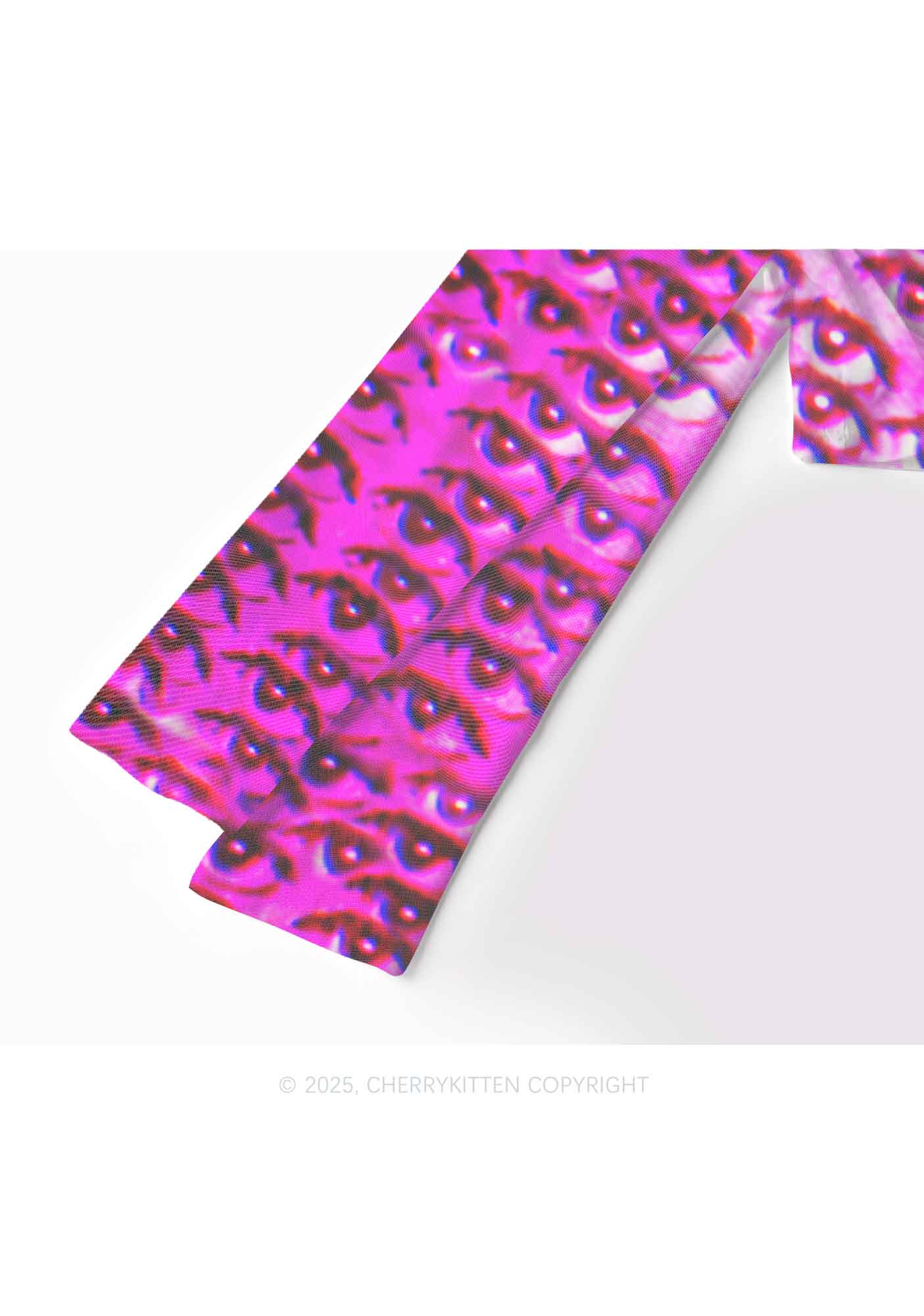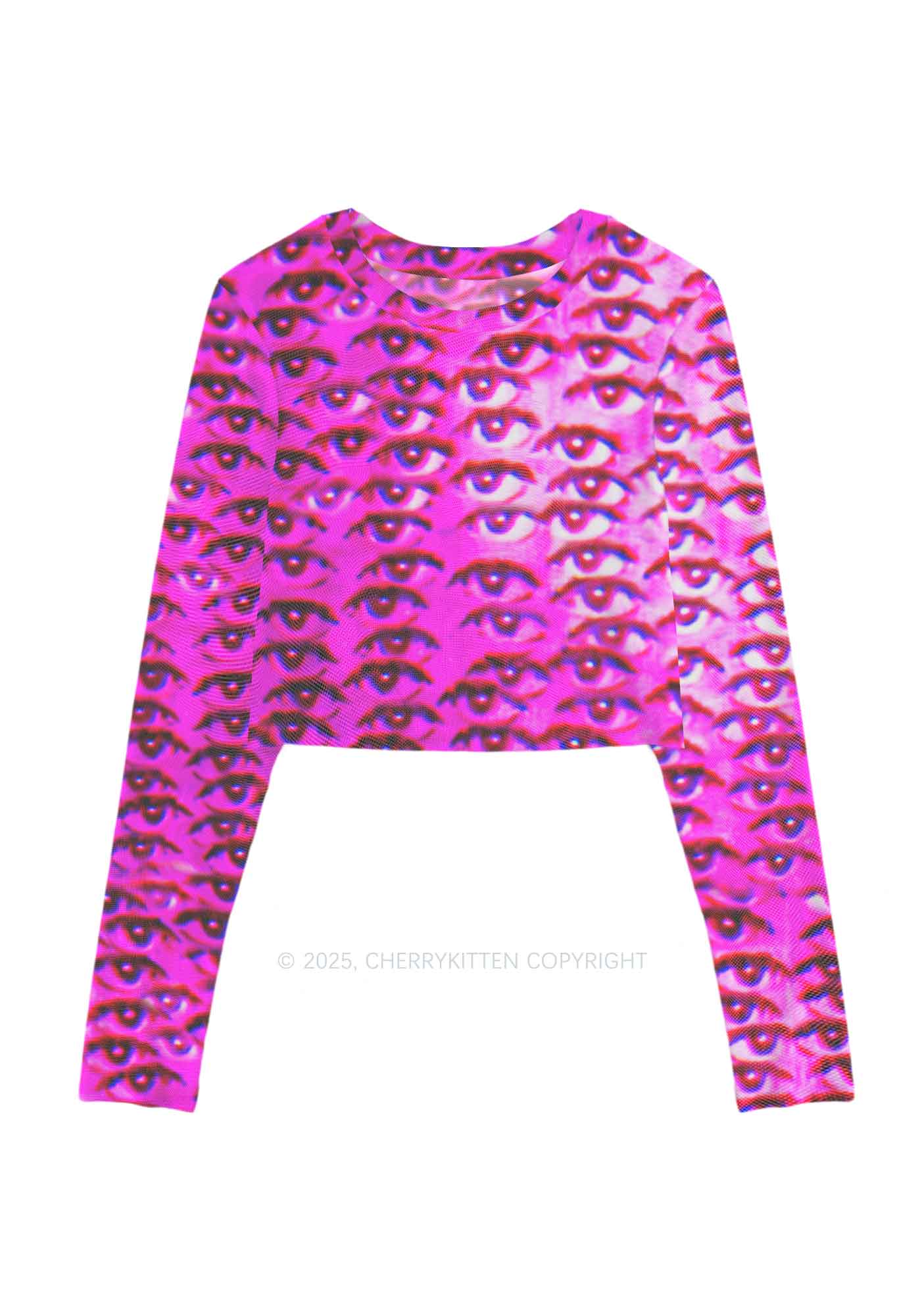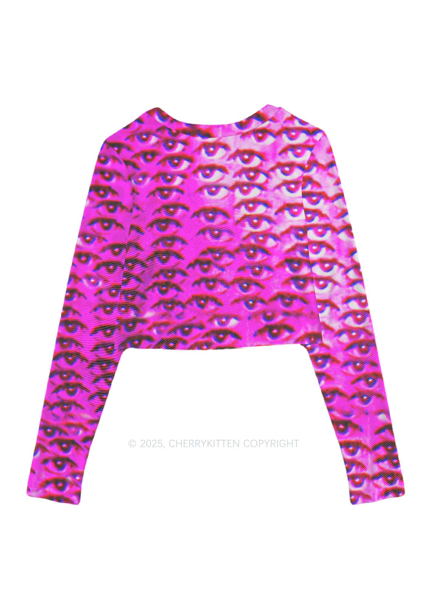 Halloween Pink Eyes Y2K Mesh Long Sleeve Crop Top Cherrykitten