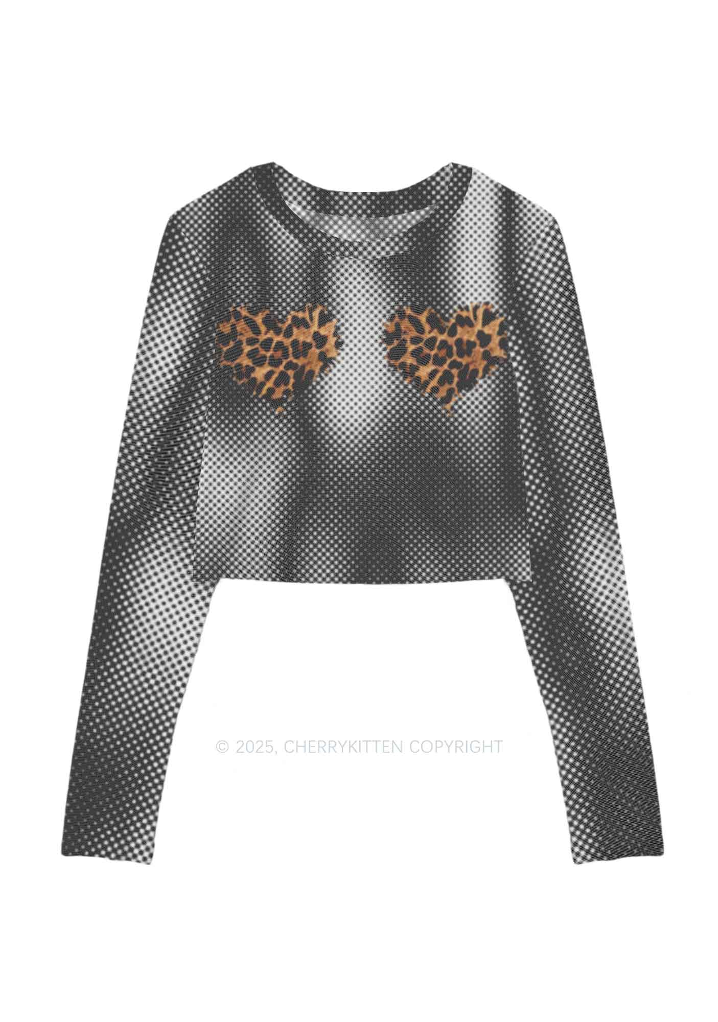 Leopard Hearts Y2K Mesh Long Sleeve Crop Top Cherrykitten