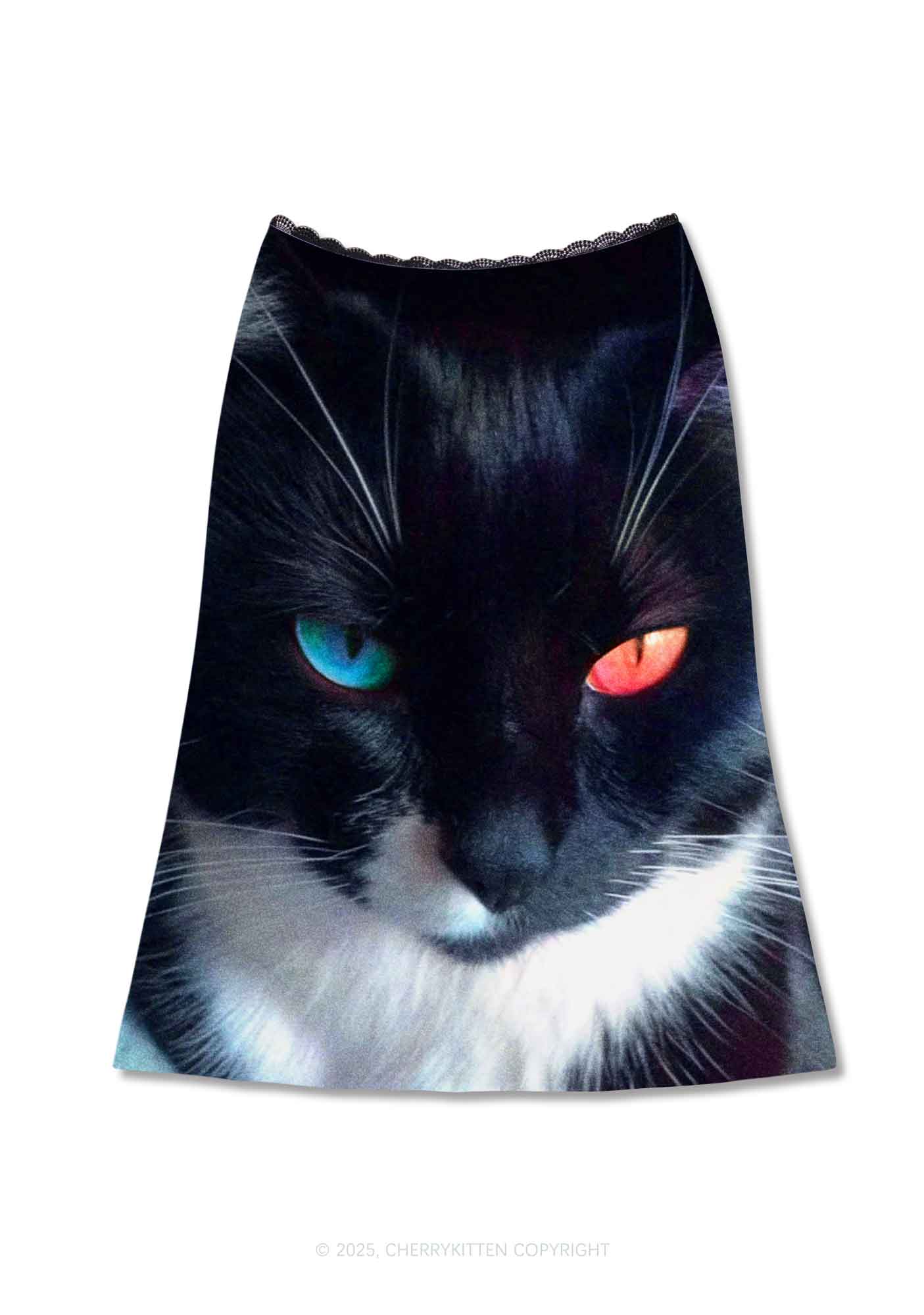 Odd Eyed Cat Y2K Print Midi Skirt Cherrykitten