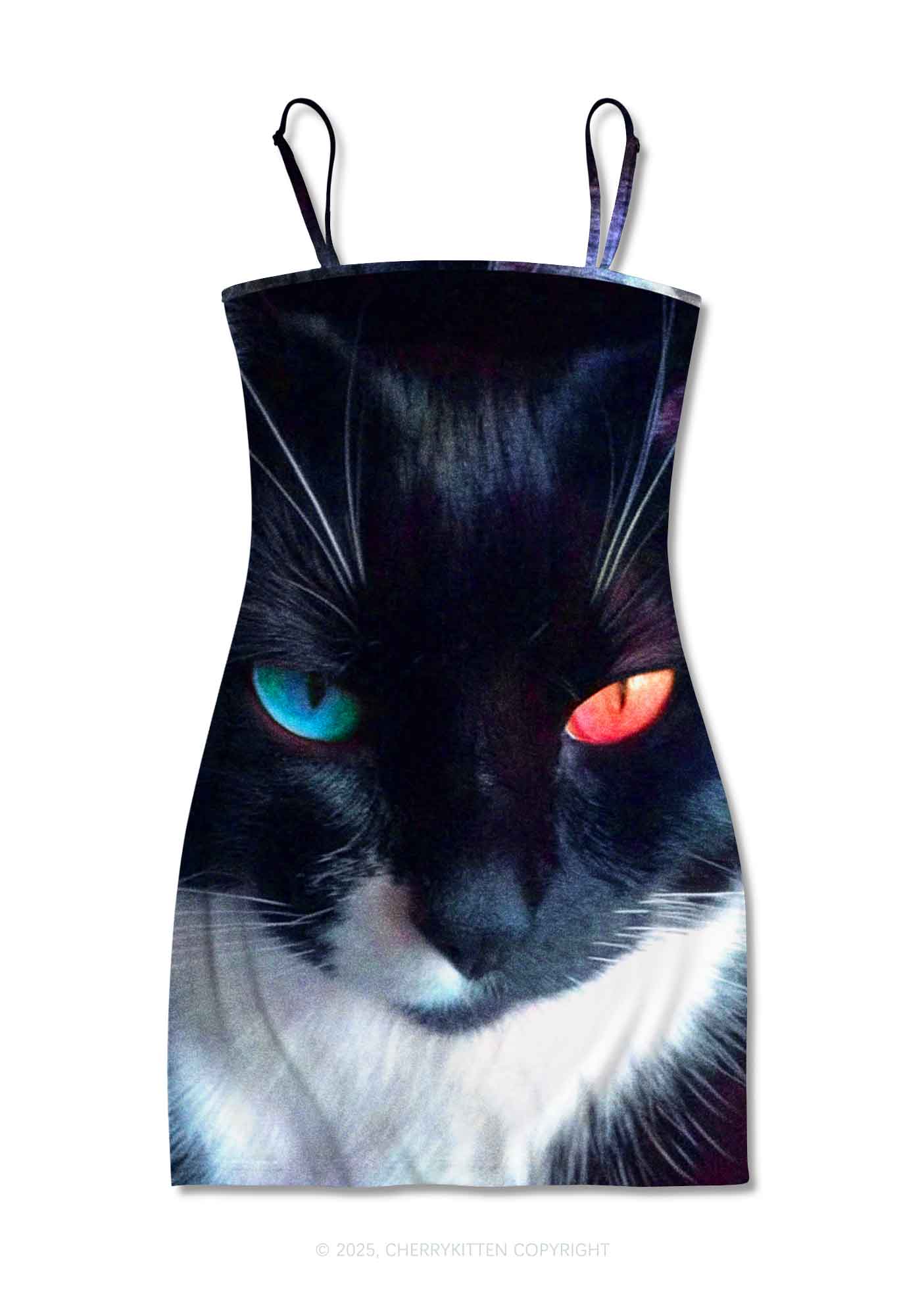 Odd Eyed Cat Y2K Print Slip Dress Cherrykitten