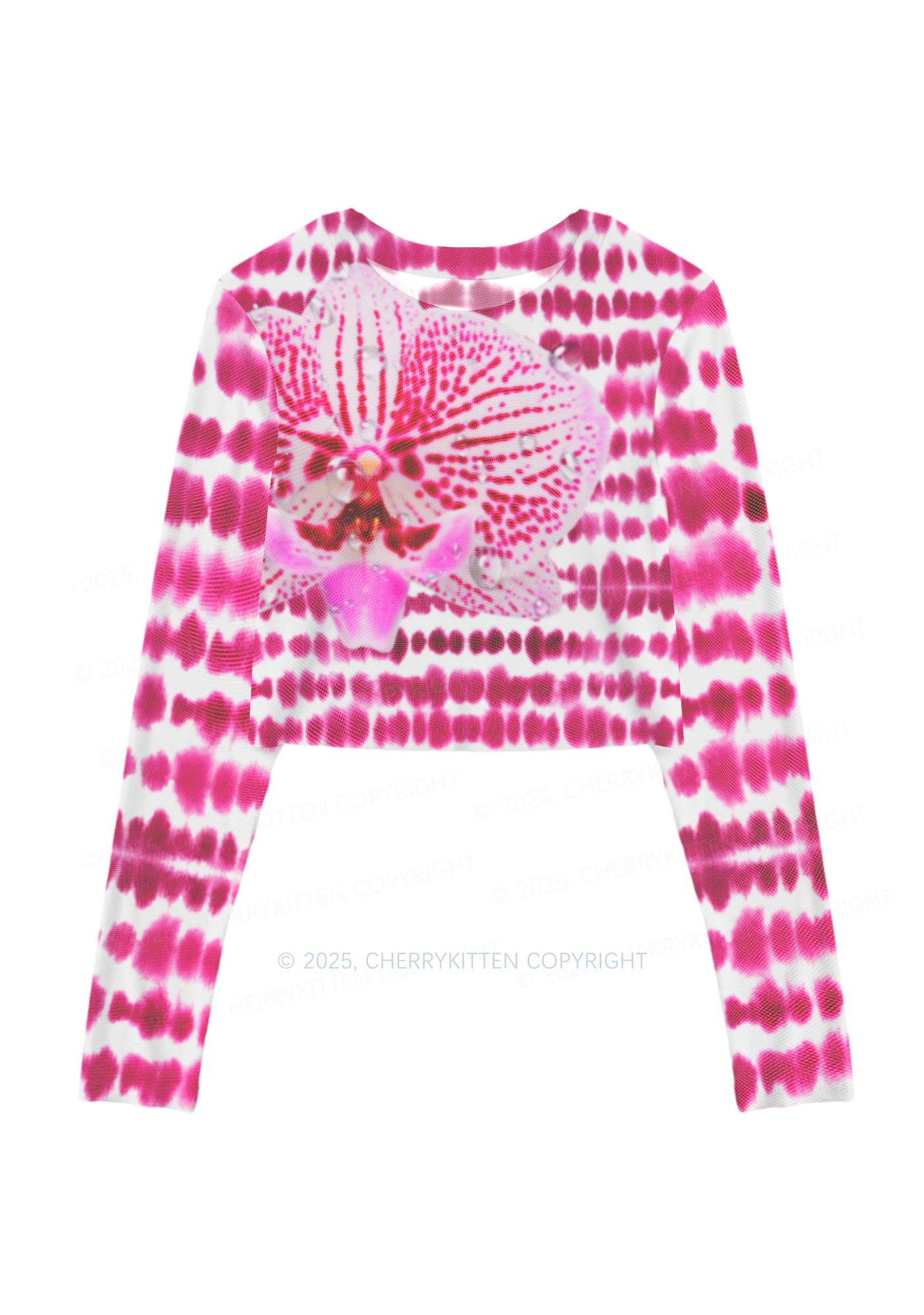 Pink Orchid Dewdrops Y2K Mesh Long Sleeve Crop Top Cherrykitten