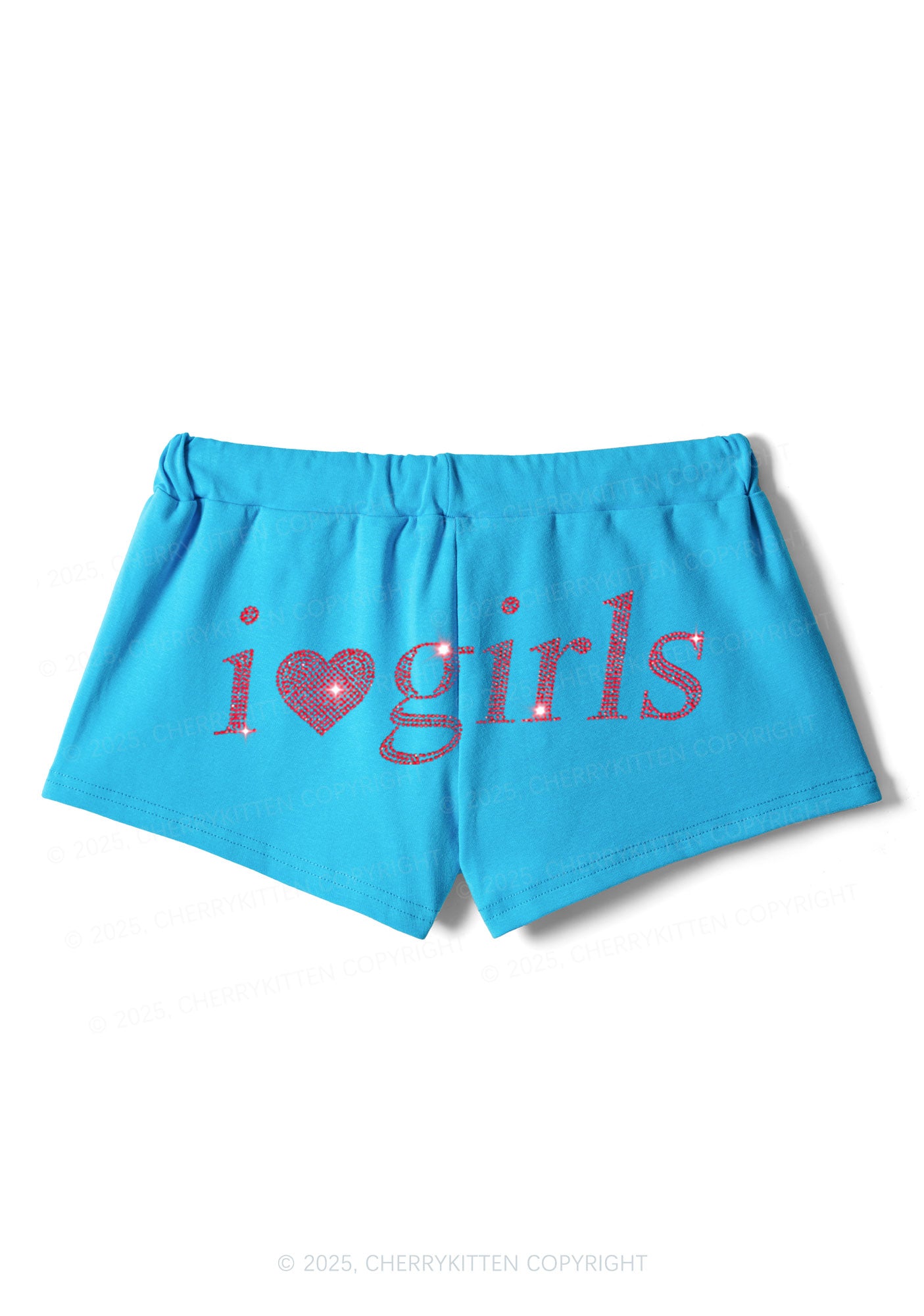 Rhinestone I Love Girls Y2K Drawstring Mini Shorts Cherrykitten