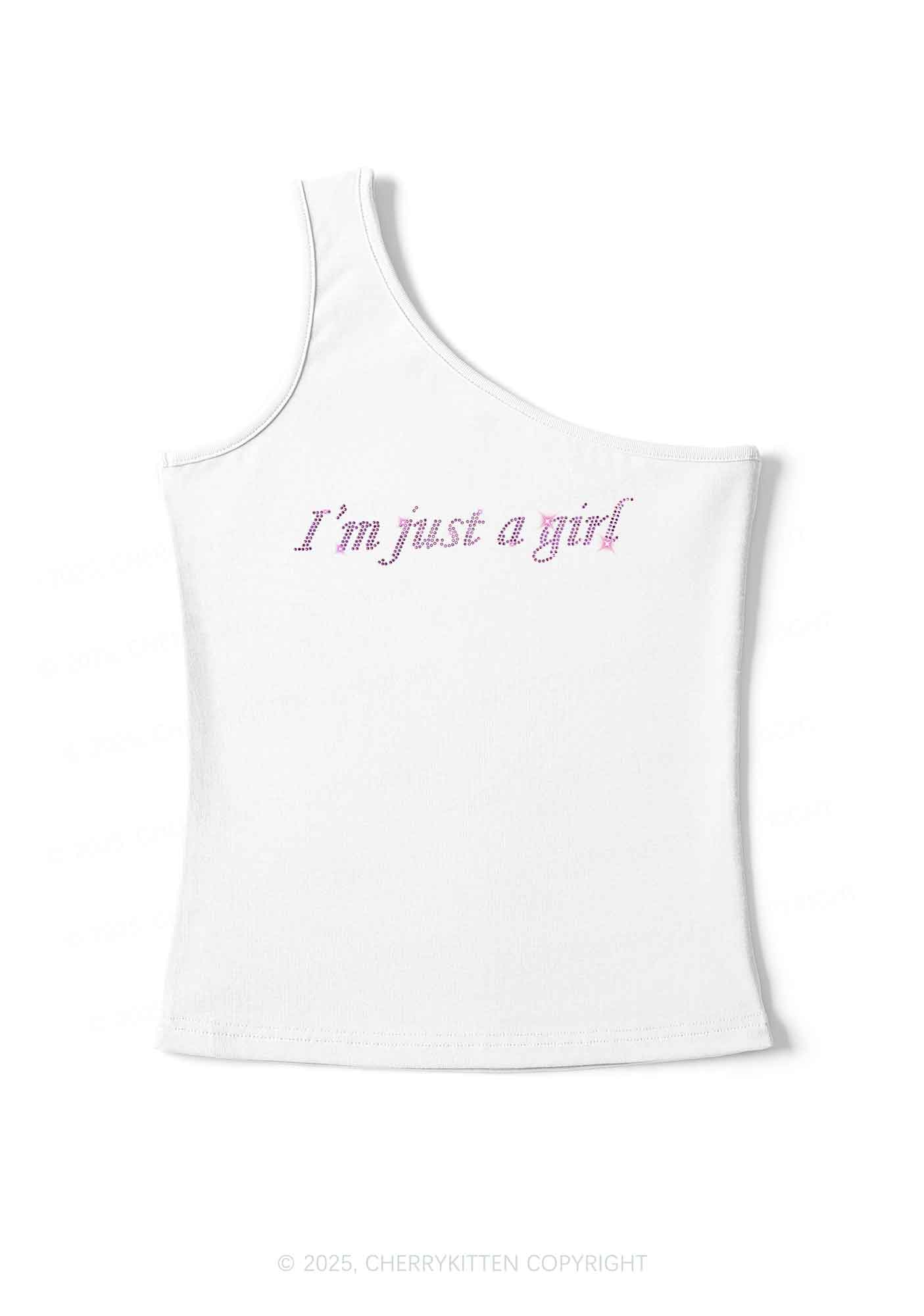 Rhinestone Just A Girl Y2K One Shoulder Tank Top Cherrykitten