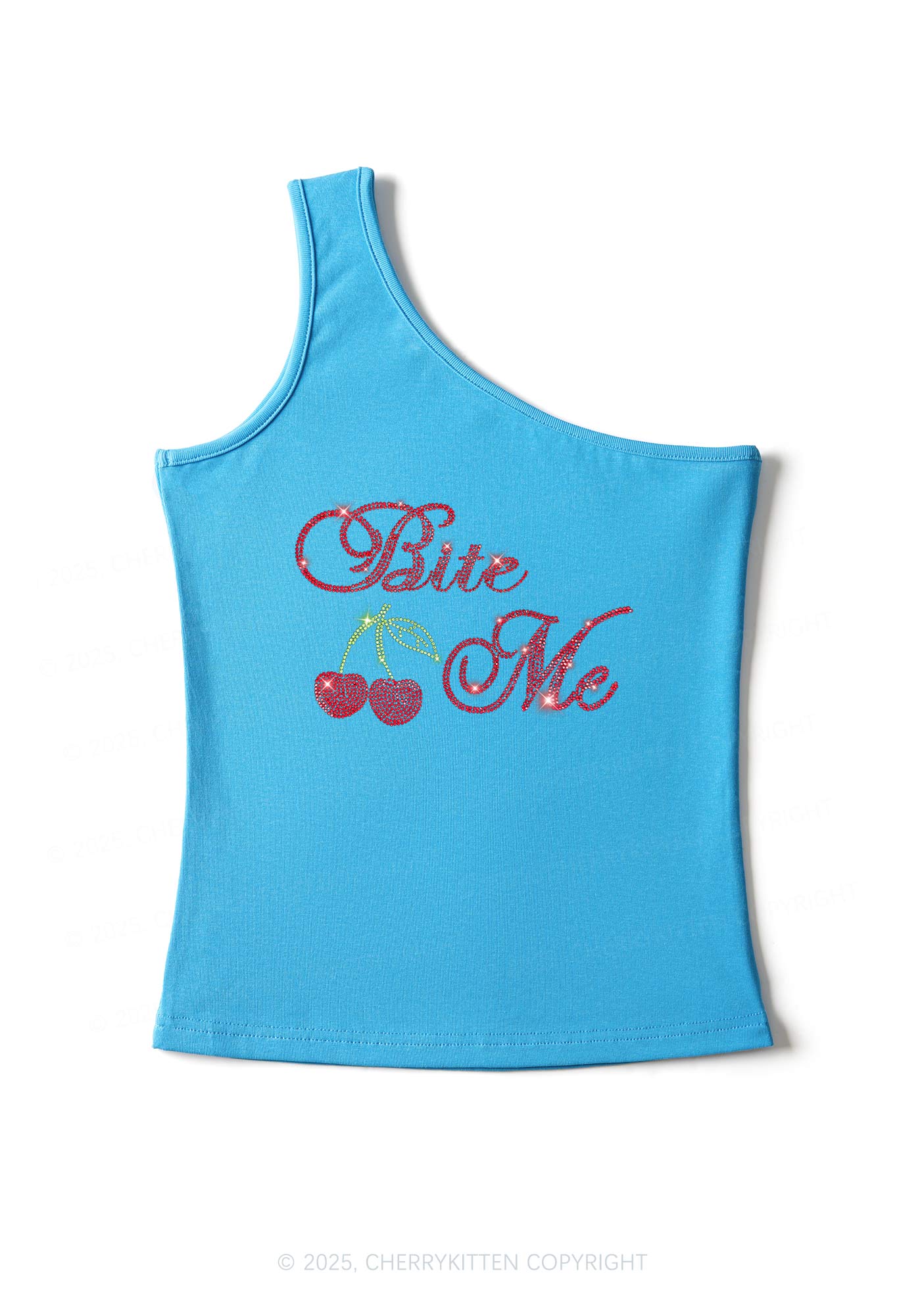 Rhinestone Red Cherry Bite Me Y2K One Shoulder Tank Top Cherrykitten