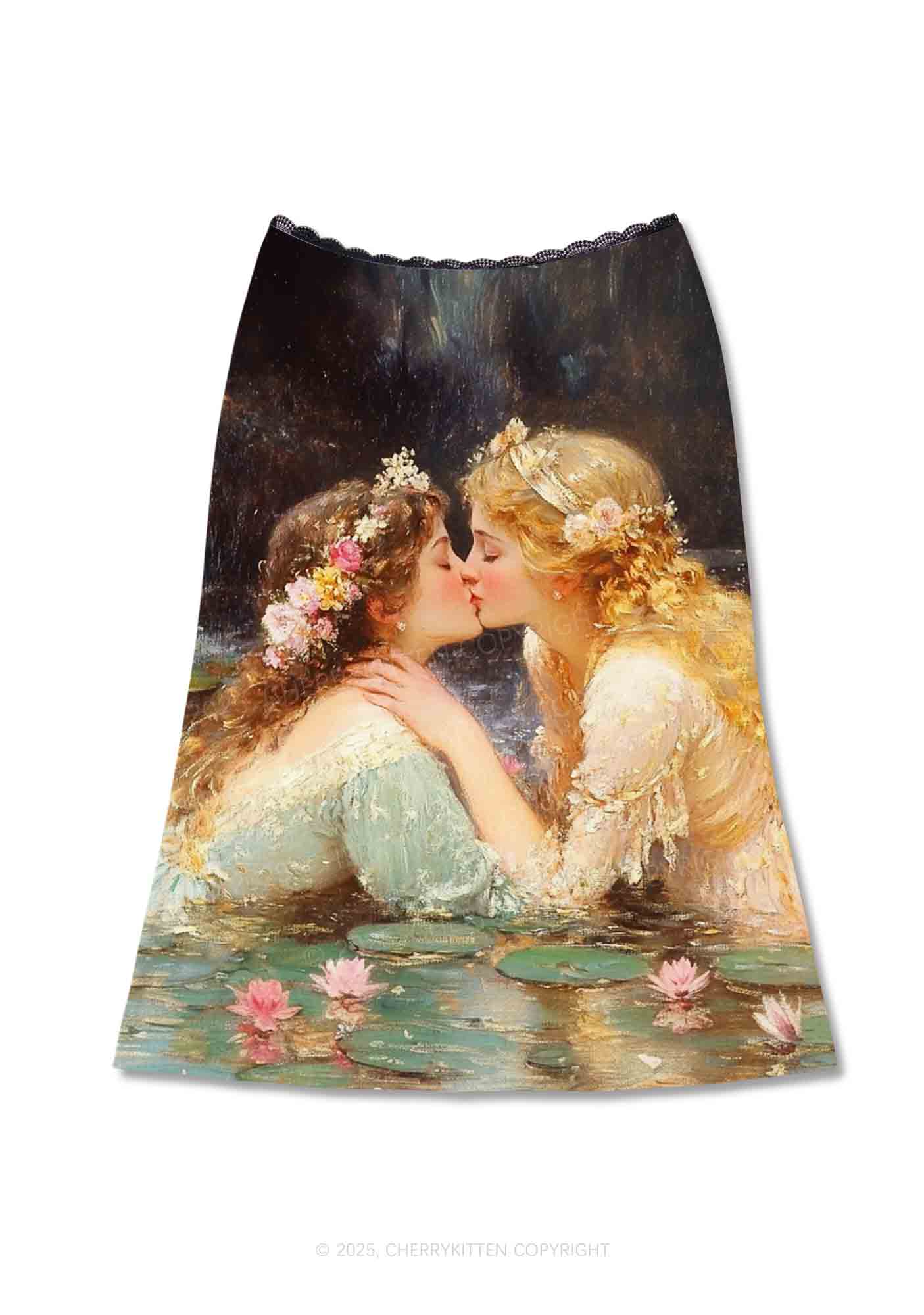 Romantic Kissing Girls Pride Y2K Print Midi Skirt Cherrykitten