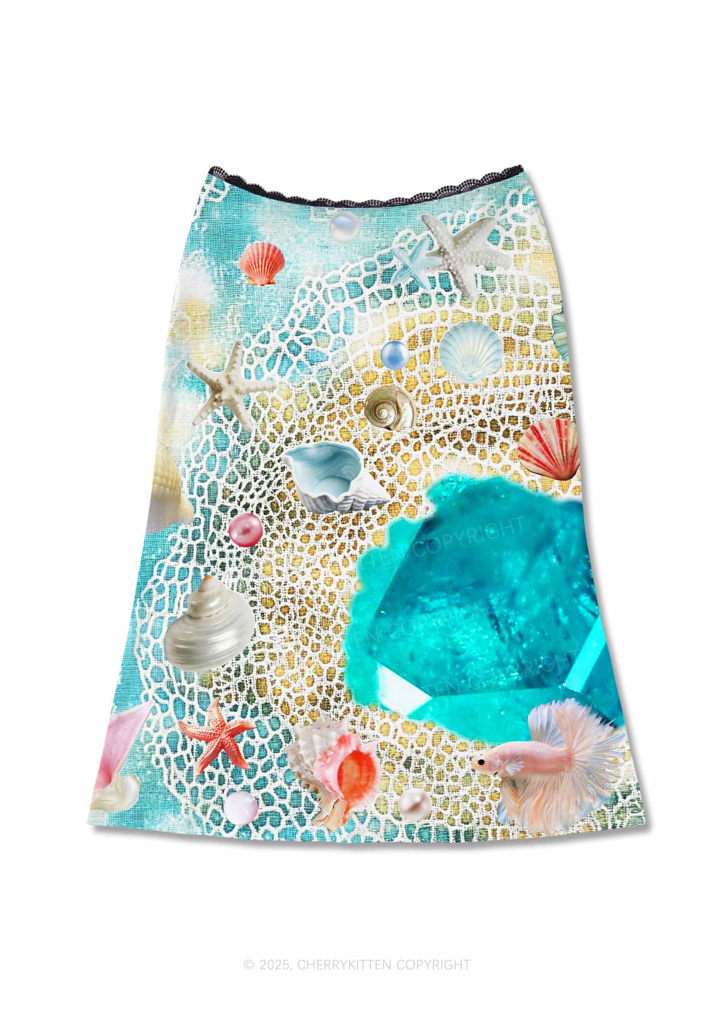 Seashell Fantasy Y2K Print Midi Skirt Cherrykitten