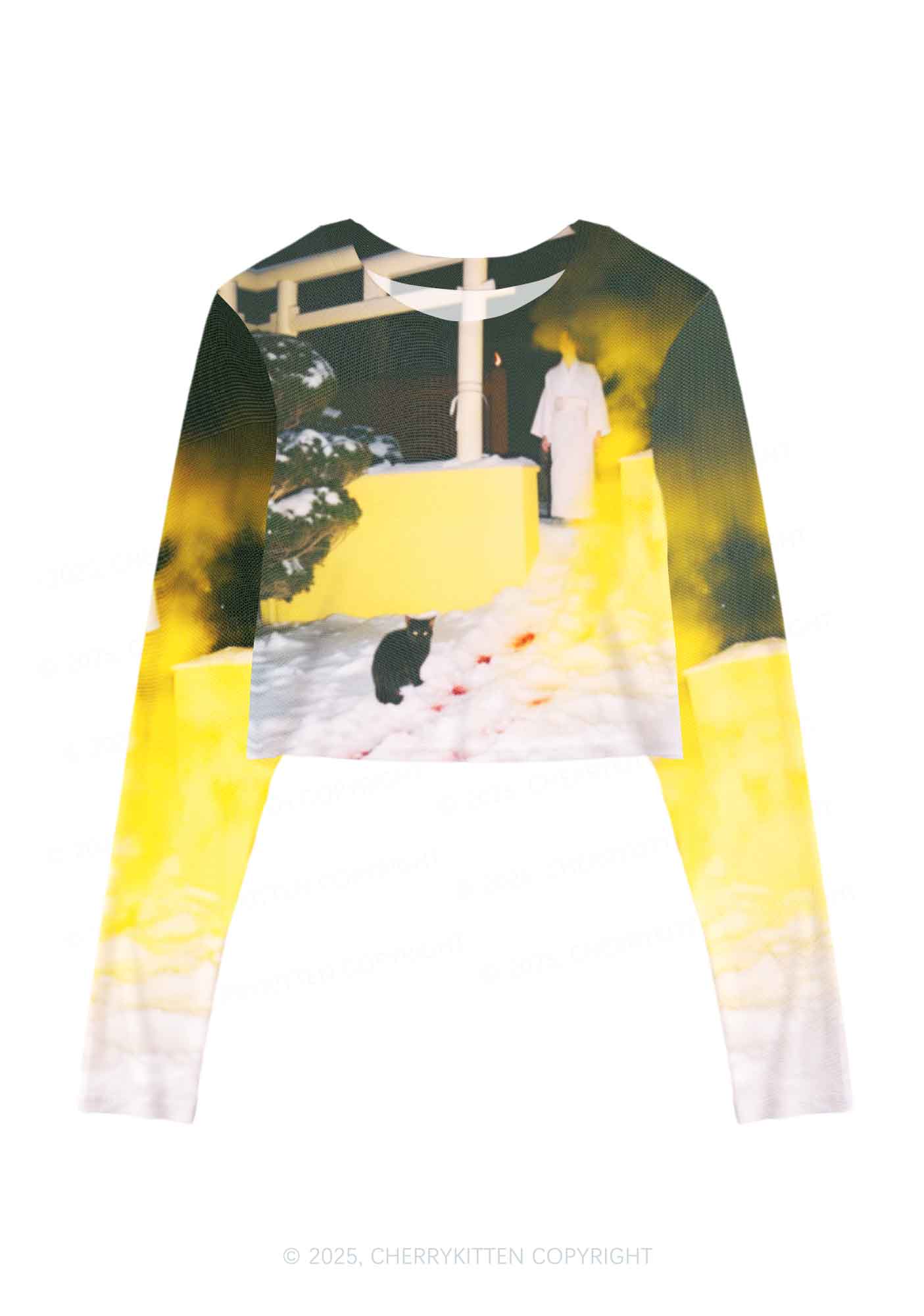 Snow Cat Y2K Mesh Long Sleeve Crop Top Cherrykitten