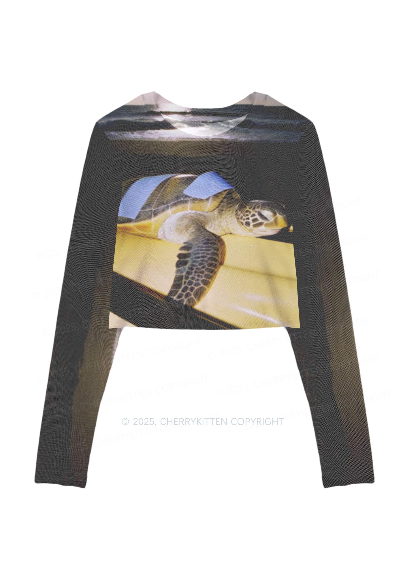 Turtle On Surfboard Y2K Mesh Long Sleeve Crop Top Cherrykitten